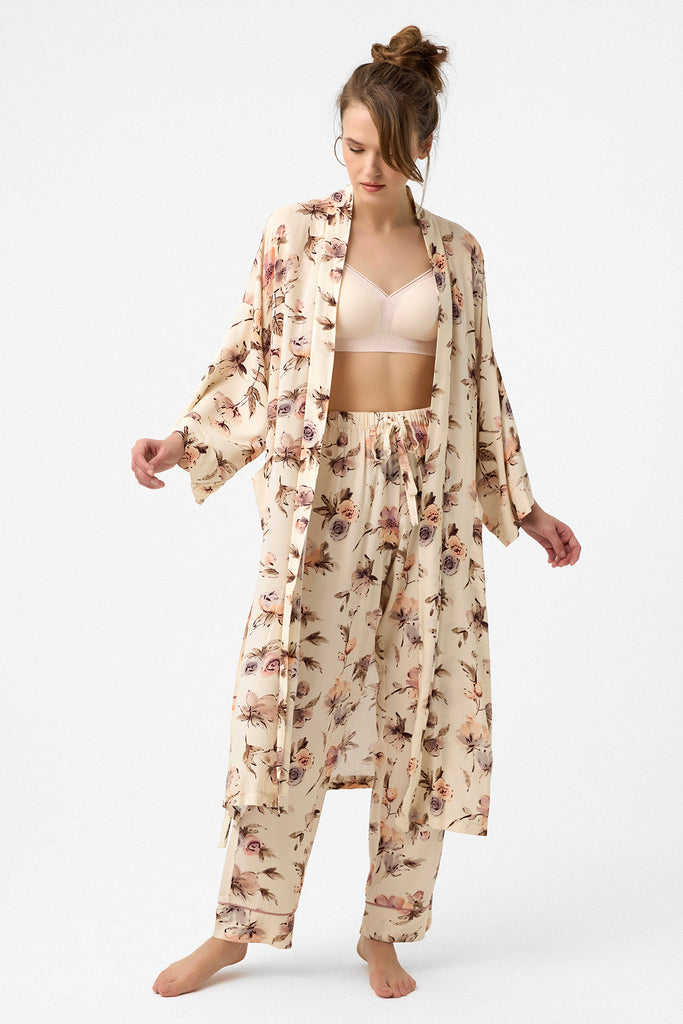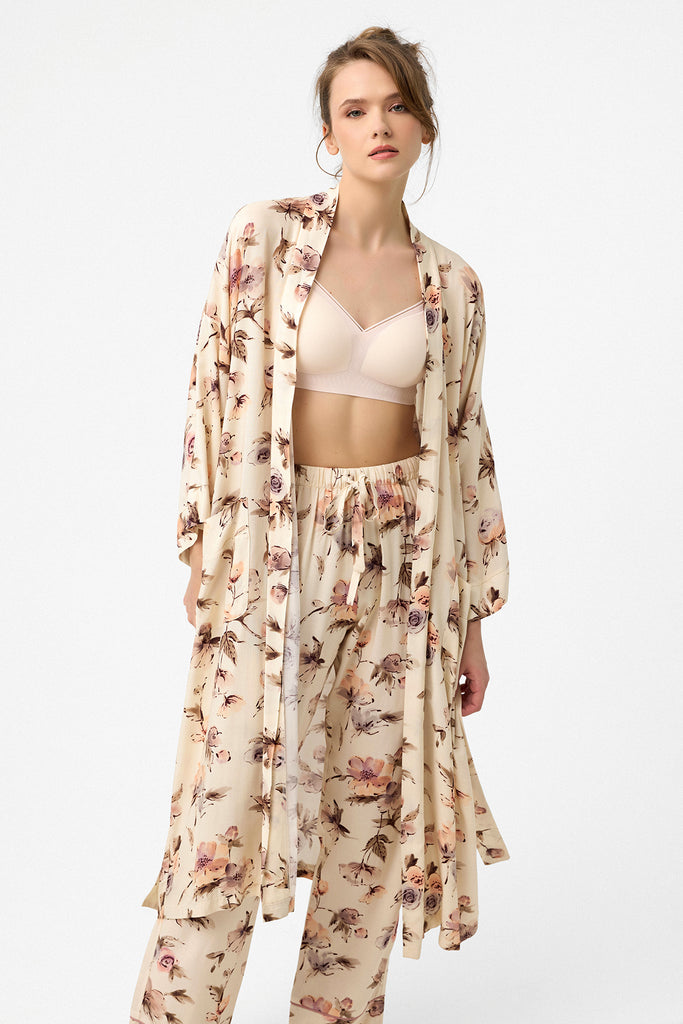 Krem renkli, pastel çiçek desenli Elissa kimono. Viskon kumaştan tek beden olarak üretilmiştir.