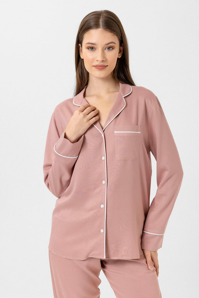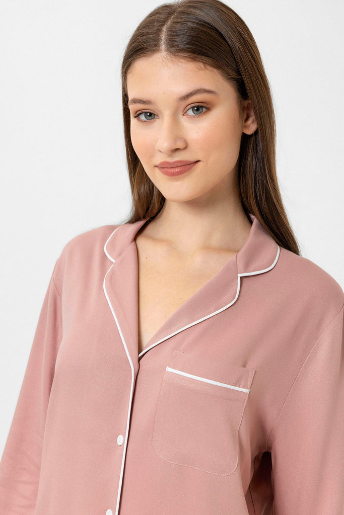 Uzun kol ve yarım kol opsiyonlu, gül kurusu renkli  Hera pijama takım.  Beyaz renkli  biyeleri şık bir görünüm sunar. Kemeri sayesinde pantolon belinize göre ayarlanabilir. Önden düğmeli üstü emzirenler için kullanım kolaylığı sağlar.