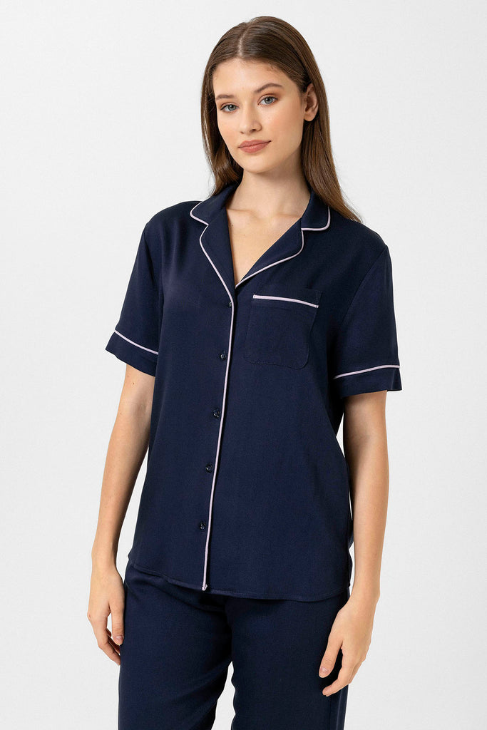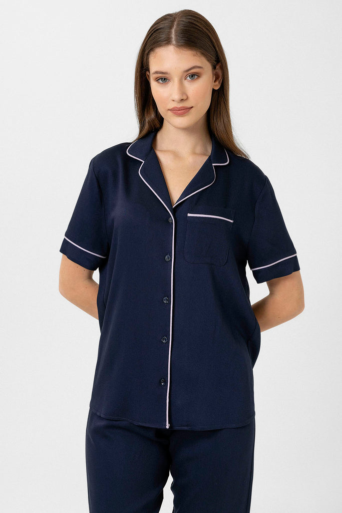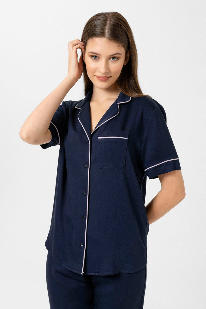 Uzun kol ve yarım kol opsiyonlu, lacivert Hera pijama takım. Lila renkli biyeleri şık bir görünüm sunar. Kemeri sayesinde pantolon belinize göre ayarlanabilir. Önden düğmeli üstü emzirenler için kullanım kolaylığı sağlar.