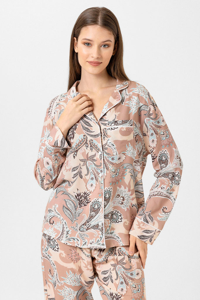 Şal desenli, özel dijital baskı, Hera pijama takım.  Yarım kol ve uzun kol opsiyonu vardır. Beyaz biyeler şık bir görünüm sunar. Kemeri sayesinde pantolon belinize göre ayarlanabilir. Önden düğmeli üstü emzirenler için kullanım kolaylığı sağlar.