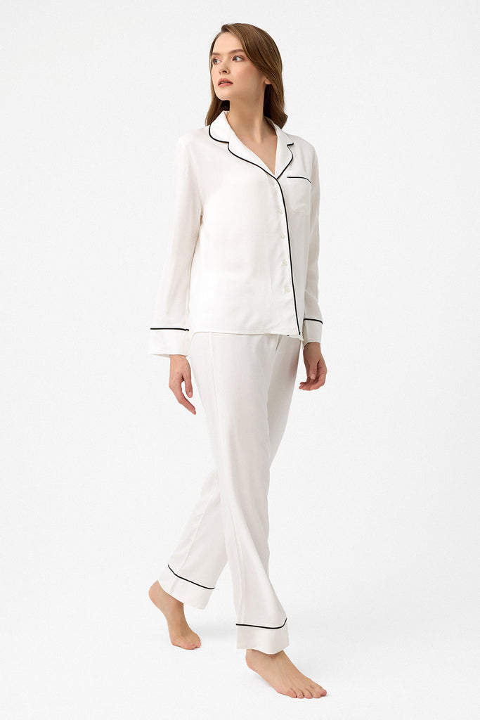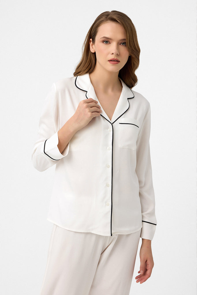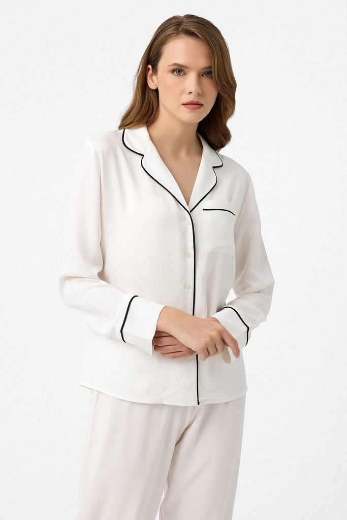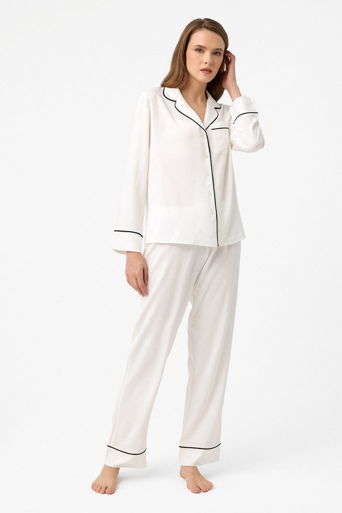 Ekru renkli Hera pijama takım.  Siyah biyeleri şık bir görünüm sunar. Kemeri sayesinde pantolon belinize göre ayarlanabilir. Önden düğmeli üstü emzirenler için kullanım kolaylığı sağlar.