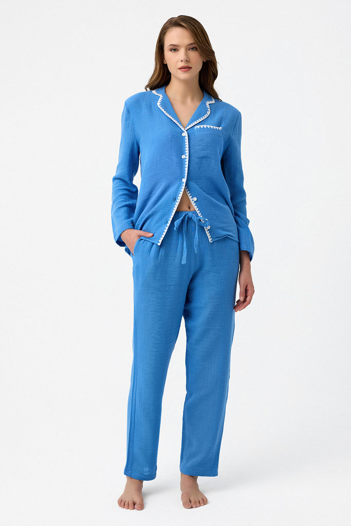 Nakışlı müslin Lara Pijama Takım - Mavi