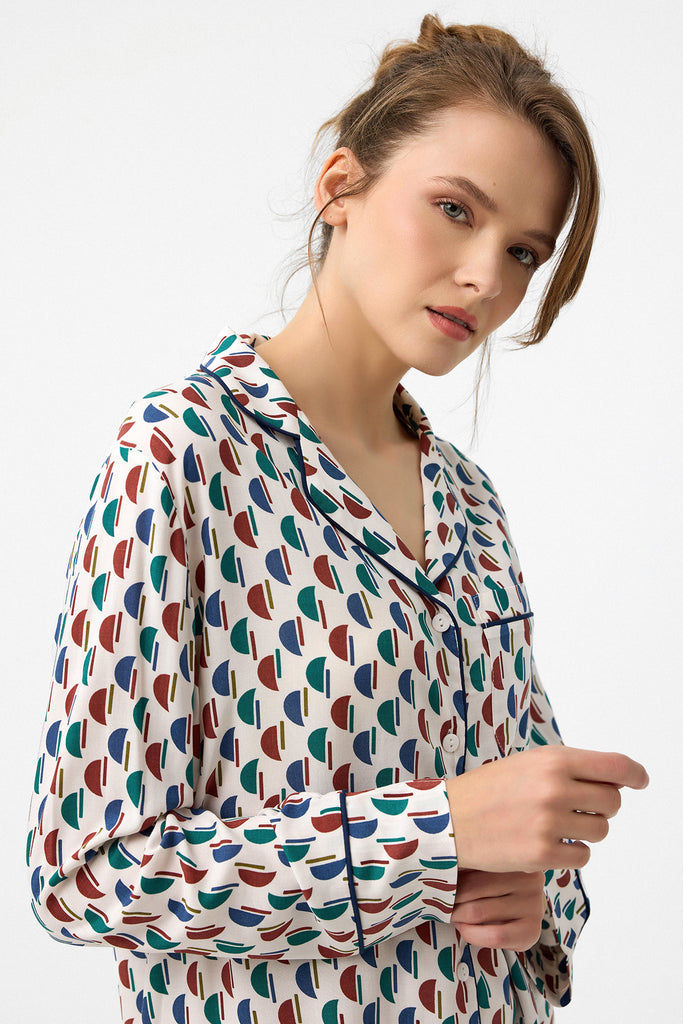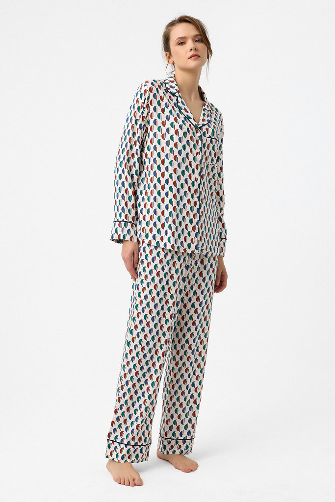 Özel dijital baskı, Hera pijama takım. Lacivert biyeleri şık bir görünüm sunar. Kemeri sayesinde pantolon belinize göre ayarlanabilir. Zarif deseni ve dökümlü kumaşıyla evde şık ve rahat olmaya özen gösterenlerin tercihi. Önden düğmeli üstü emzirenler için kullanım kolaylığı sağlar.