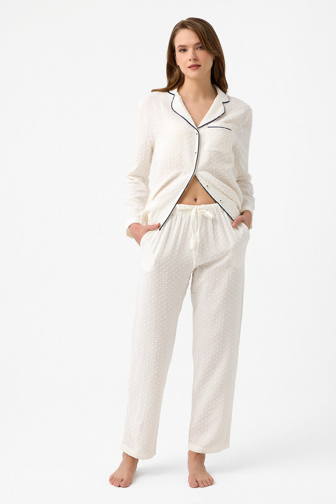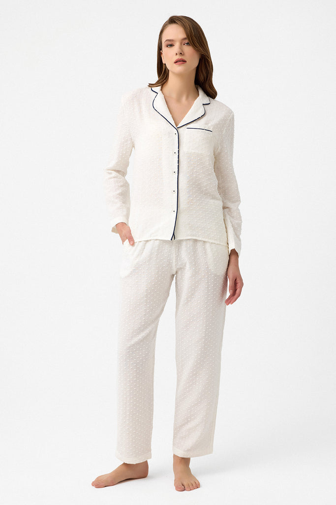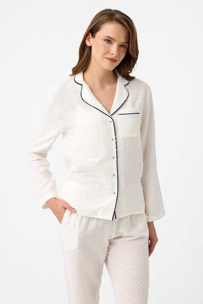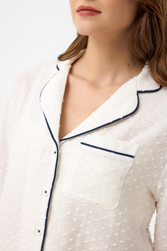 %100 pamuklu çift kat müslin kumaş, beyaz Lara pijama takım. Lacivert biye detayı şık bir görünüm sunar. Yumuşak dokusu ile rahat bir kullanım sağlar. Pantolon ceplidir, kemeri sayesinde belinize göre ayarlanabilir. Önden düğmeli üstü emzirenler için kullanım kolaylığı sağlar.
